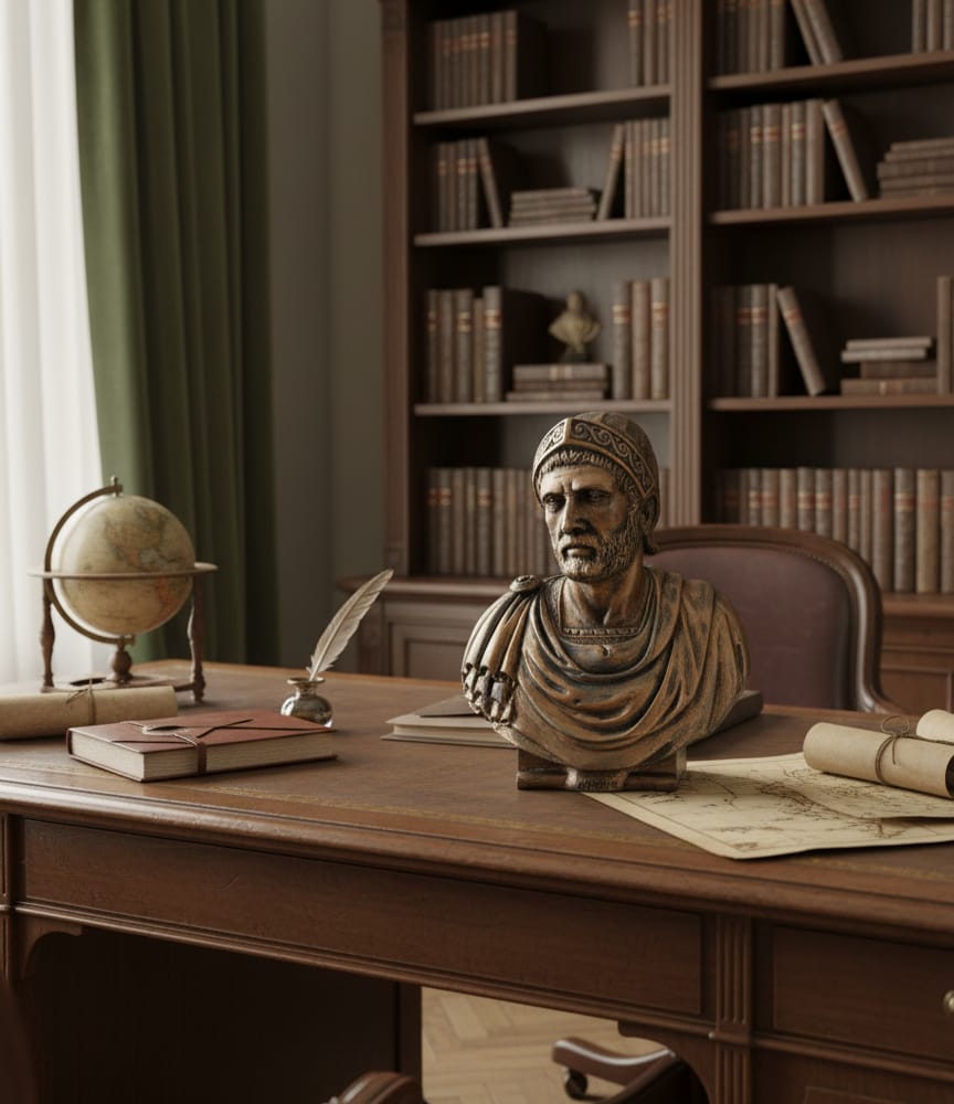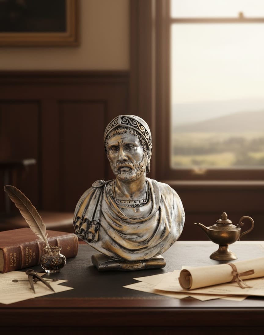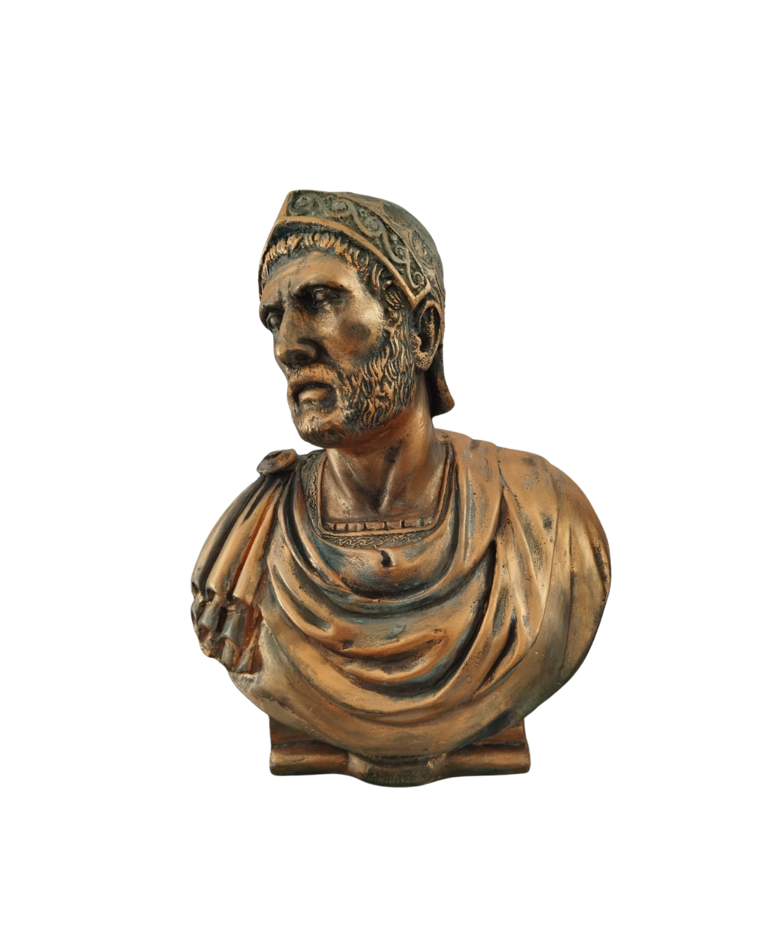 Buste d'Hannibal Classique en Résine. Capturez l'essence de l'Antiquité avec ce buste aux traits expressifs. Sa finition en résine de haute qualité imite parfaitement l'aspect du marbre ou de la pierre ancienne, soulignant les détails de la coiffure et du drapé. C'est l'hommage parfait au stratège invaincu et un point focal élégant pour tout intérieur.