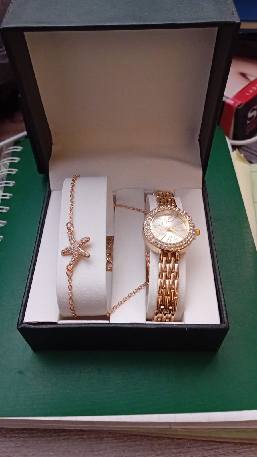 Ajoutez une touche de glamour à votre style avec ce duo élégant composé d’une montre et d’un bracelet assorti en acier inoxydable couleur dorée. Conçus pour durer, ces accessoires raffinés allient durabilité et luxe discret pour sublimer toutes vos tenues.