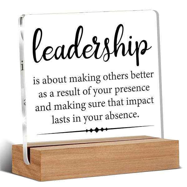Cette pancarte en plexi avec socle en bois est un hommage élégant à la véritable essence du leadership. Elle porte la citation :
